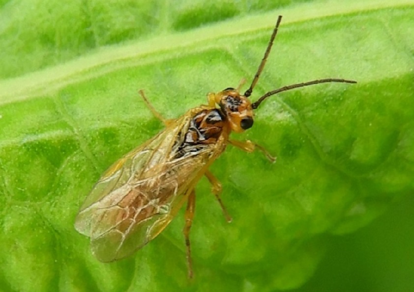 Bij de foto: ‘Als u een nematus bladwesp vindt, ook als het een honingkleurige is met een wat verschroeide kop en borststuk, wordt het onbegonnen werk om de soort te bepalen. Dus als u ooit een goed gelijkend exemplaar tegen mocht komen: ’t zal wel niet dezelfde soort zijn. Maar wèl een nematus.’
