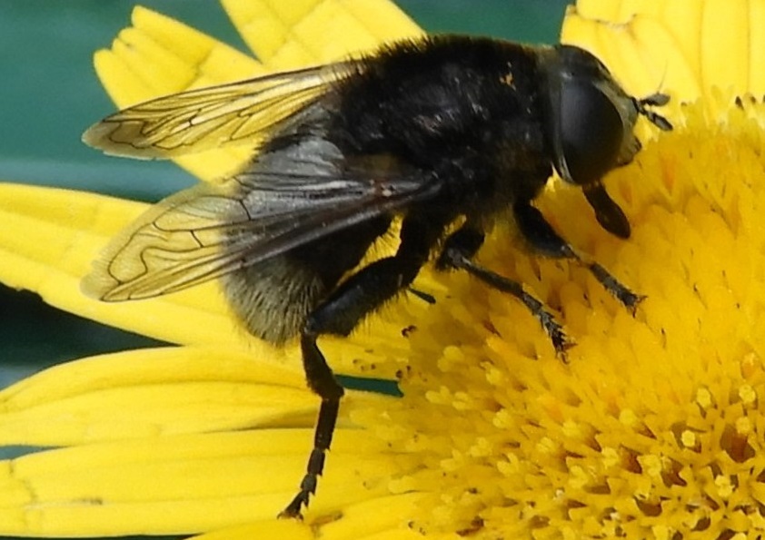 Udo: ‘Zweefvliegen kunnen zweven, zoals een helicopter. En vele hebben het uiterlijk van een wesp, een bij of een hommel. De grote narcisvlieg is zo’n “hommel”, met onderling grote verschillen in kleuren en kleurenpatroon. Oòòòf je ziet er een die lijkt op een grooote bromvlieg. Zoals deze.’