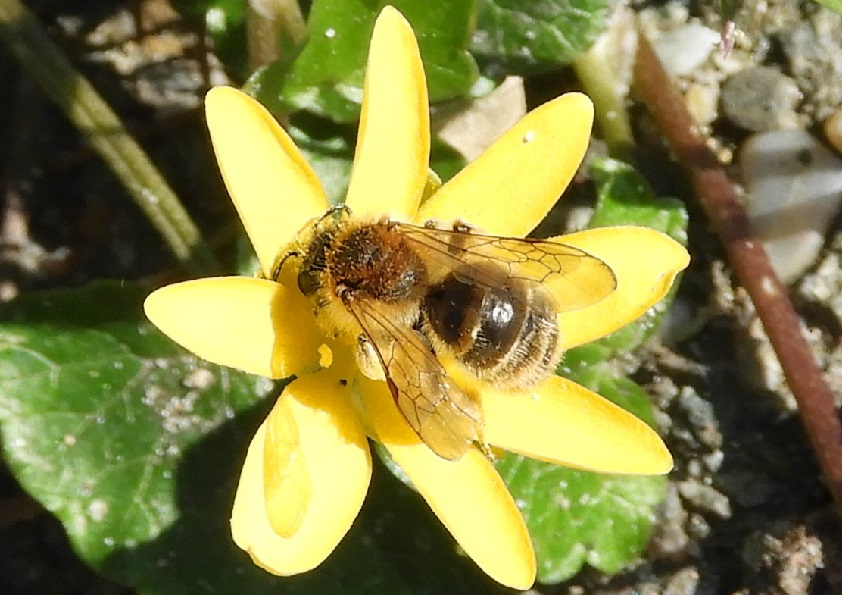 Udo: ‘Tsja, een witbaardzandbij, of zo. Eén van die 75 soorten zandbijen die in Nederland (en soms ook in Nieuwegein) kunnen voorkomen. Al te zien in maart, maar moeilijk als soort te herkennen. Wel als zandbij. En als vroege voorjaarsbode, net als sommige hommels.’