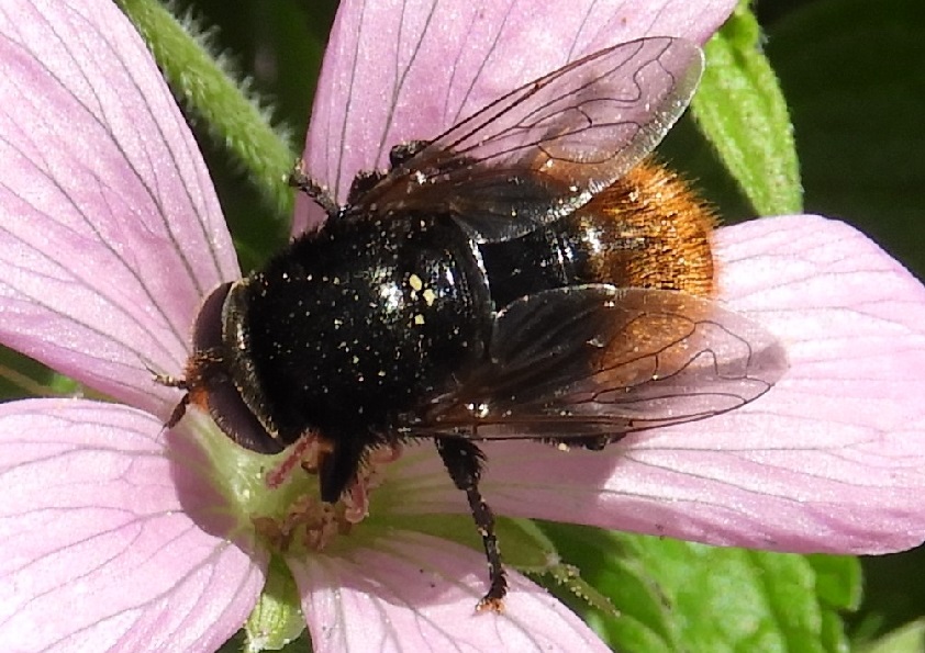 ‘Dit jaar vond ik zo’n nephommel in zwarte uitvoering met een oranje eind. Dus heeft deze wat weg van een steenhommel en dat was hier nog niet eerder vertoond. Weliswaar zijn steenhommels meestal kleiner en slanker en zijn ze enorm ijverig, wat je van de grote narcisvlieg niet kunt zeggen. Maar die vlieg heeft ook geen hongerige jonkies te verzorgen.’