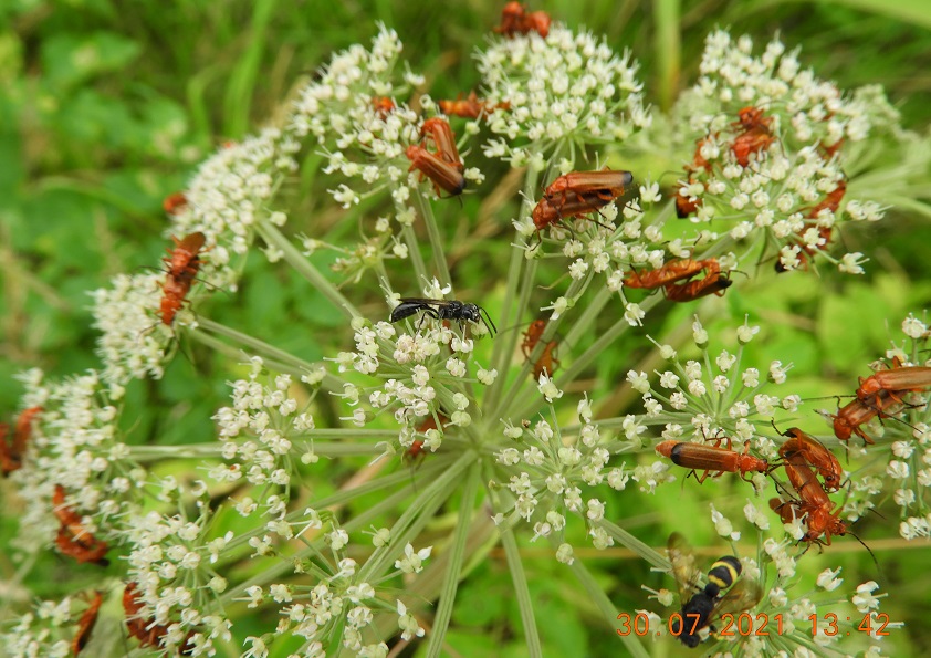 ‘De grote schermbloemen van de gewone berenklauw dienen voor veel insecten als een soort terrasjes. Daarop zijn in de zomer dikwijls rode weekschildkevertjes te zien. Soms maar een paar, vaker wat meer en tegen de veertig (!) kan ook. Die schermbloemen hebben heel wat stuifmeel en nectar, dus met meerdere kevertjes maken ze er een party van. Meteen maar een sex party, en zo sleept het leven van deze kevertjes zich voort tot ze worden opgegeten door allerlei spinnen en ander klein gespuis, of omdat ze gewoon op zijn.’