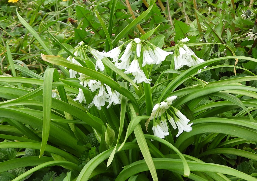 Udo: ‘De aanwezigheid van de vele wilde en verwilderde planten in Nieuwegein is geen constant gegeven. Jaarlijks komen er een aantal bij en verdwijnt er ook weer wat. In dit jaar begint het al in april, en daarvan is de Driekantige look de eerste. Driekantige look is een “wilde” uiensoort, afkomstig uit de hogere delen van Zuid-Europa maar hier soms opduikend in bermen, wegkanten, plantsoenen enzovoort. Misschien ook wel als tuinplant. Zo’n 20 cm hoog en eigenlijk niet zo gelijkend op de meeste andere uien, maar als je even op een blaadje wrijft en aan je vingers ruikt : met een echte uiengeur, maar zonder dat je de tranen in de ogen springen.’