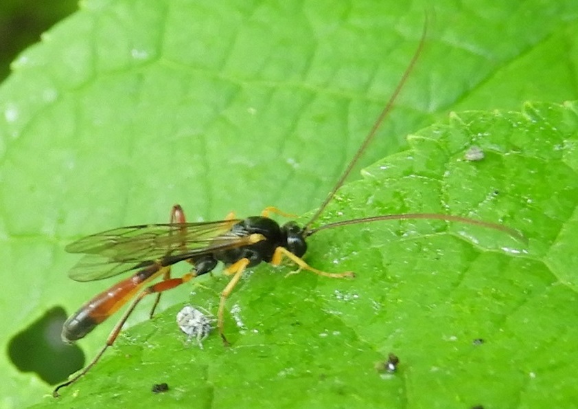 ‘Gelukkig zijn er ook wat soorten die vrij regelmatig gevonden worden. Als dan ook nog een foto wordt doorgegeven aan Waarneming.nl, kunnen ze daar een gooi doen naar het geslacht en de soort. Als het een minder of zelden gevonden soort betreft is het: onbekende soort òf (waarschijnlijk) geslacht. Niettemin: deze keer een foto van een sluipwesp uit de phytodietus familie, pas gevonden in de heg van de achtertuin. De beestjes parasiteren op de rupsjes van bladwespen, en die zijn er momenteel in overvloed. De soort was niet te vinden, maar u weet nu hoe dat komt.’