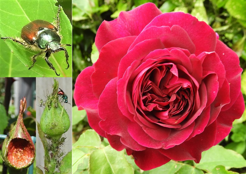‘En dan is er de rozenkever. Een opvallende kever met een metaalroodbruin lijf en een metaalgroene kop en borststuk, en ook al zo’n rozenliefhebber. Als zo’n kever in de zon zit is hij fraai om te zien, maar de wat oudere kevers ogen eerder griezelig. Wat ze doen met rozenknoppen en soms ontluikende rozen is onvergeeflijk, ze eten er van! Dus wat doe je dan? Gewoon in de kliko gooien, voor de eigen gezondheid is het beter niet naar een spuitbus te grijpen.’