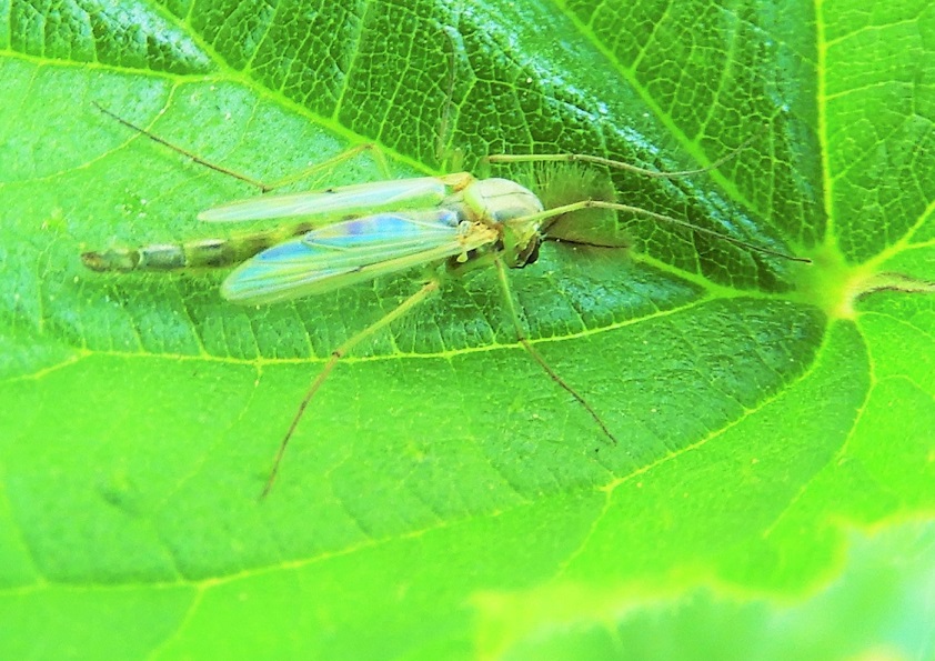 ‘Gelukkig kunnen deze beestjes niet steken. En als er per ongeluk een in je oog komt, spoelt het vaak gewoon weg omdat je oog begint te tranen. Populair zullen deze zwermen nooit worden, denk ik. Maar die dansmuggen zijn ook enkelvoudig te vinden op allerlei planten, en dan zie je iets merkwaardigs: een zeer langwerpig beestje met vaak glazige vleugels, een naar beneden gericht kopje en altijd een soort plumeaus voor hun kop. De kleur kan variëren van pikzwart tot licht grijs. Groen kan dus ook, zoals u ziet op de foto.’
