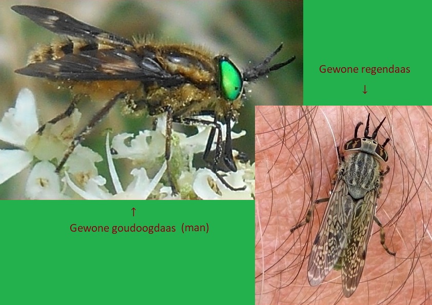 Udo: ‘Dazen betekent doordrammen, onzin uitkramen. Als iemand aan het dazen is, is dat behoorlijk irritant voor de mensen die dit moeten aanhoren. Er zijn ook vliegen die dazen genoemd worden en die kunnen ook behoorlijk irritant zijn. Daarvan zouden in Nederland zo’n 35 soorten voorkomen. Van al die dazen zijn de vrouwtjes, net als bij steekmuggen, belust op het bloed van zoogdieren. Daarvan zijn de meeste “gespecialiseerd” op bepaalde dieren, zoals de runderdaas. Maar het is waarschijnlijk dat ze hun voorkeur vergeten als ze echt honger hebben en er geen “bepaalde dieren” te vinden zijn.’