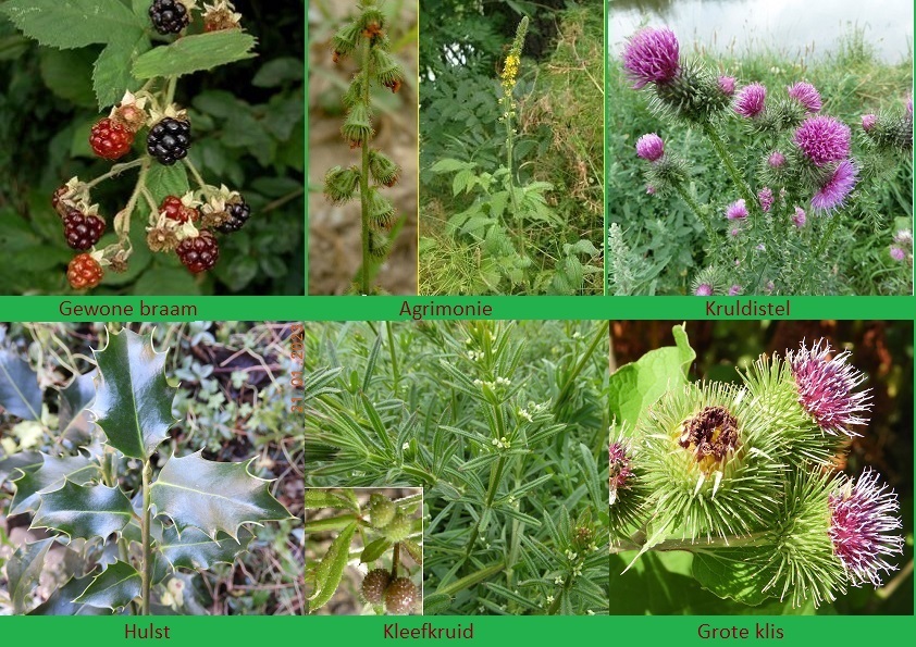 ‘Voorbeelden zijn gewone agrimonie en kleefkruid. De grote klis is een buitenbeentje, alleen de klis is voorzien van stekels met haakjes en de bloem lijkt op de bloem van een distel.’