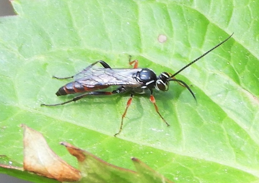 ‘Op de foto lijkt dit een kanjer van een zwarte wesp, maar hij of zij is op een plantenblaadje een schriel zwart rondrennend streepje van 1 cm lang.  Niet zo een waarvan je denkt:  “O Ja”. Want er zijn meerdere zwarte wespjes die er op lijken. Allemaal zwart en klein en onopvallend, tenzij ze door de tuin jakkeren, maar dan kan het ook een of ander vliegje zijn.’