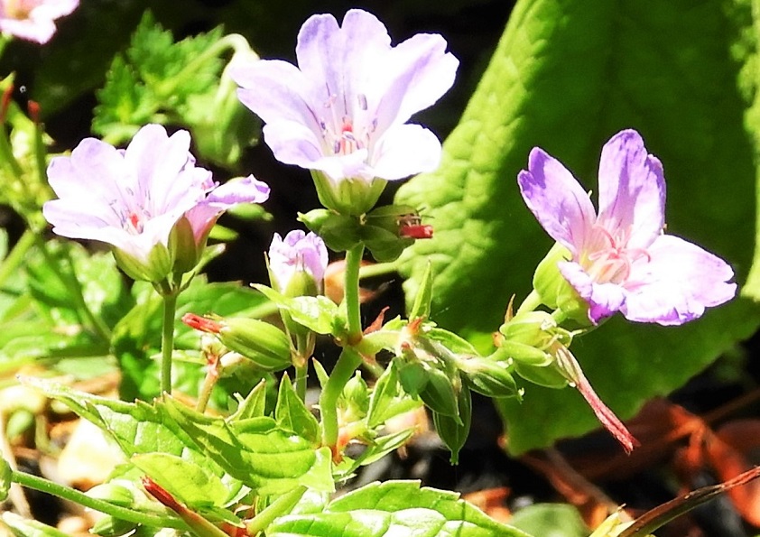 Udo: ‘Knopige ooievaarsbek komt uit Zuid- en Midden-Europa en is in Nederland geïntroduceerd als vaste tuinplant. De bloempjes zijn talrijk maar klein, en zijn roze met een blauwzweem (lila?) en hebben de vorm van een klokje dat is samengesteld uit vijf kroonblaadjes zoals alle ooievaarsbekken.’