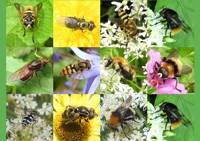 ‘Zweefvliegen zijn vegetariers. Alleen de larven eten veelal bladluizen, maar de vliegen eten, net als bijen, stuifmeel en nectar en “en passant” bestuiven ze de bloemen waarvan ze komen eten, net als de bijen.’