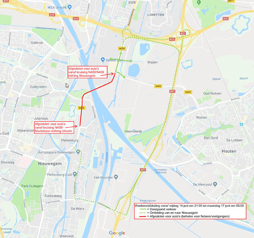 In het weekend van 14 tot en met 17 juni werkt wegenbouwer KWS aan de verbreding van de N408. Dit betreft de nieuwe aansluiting tussen bedrijventerrein De Liesbosch en de N408. De N408 tussen Nieuwegein en de N409 is van vrijdagavond 14 juni 21.00 uur tot en met maandagochtend 17 juni 05.00 uur in beide richtingen volledig afgesloten voor autoverkeer. Op bijgevoegde tekening is het afgesloten weggedeelte weergegeven.