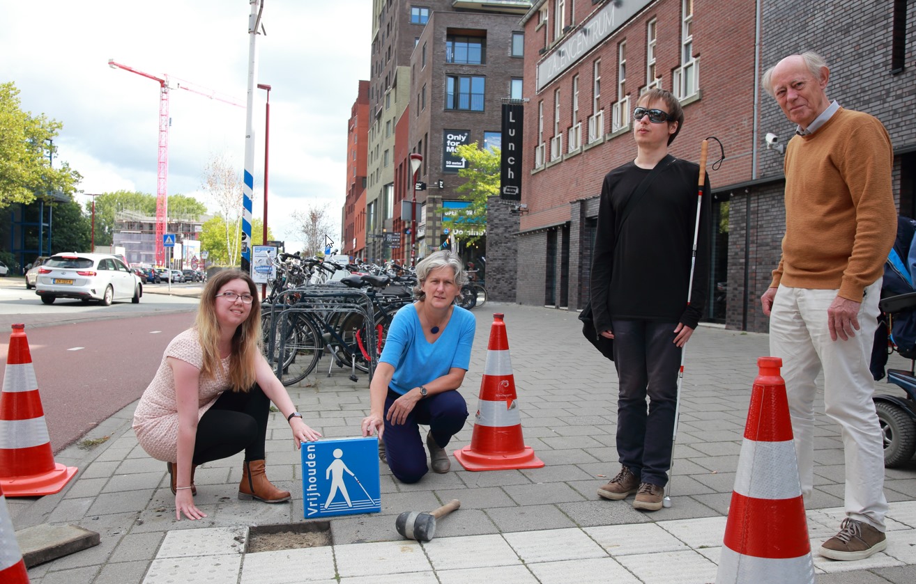 Op de foto v.l.n.r. Malou Thijssen (Stichting Houd de lijn vrij!) Marieke Schouten, wethouder openbare ruimte, Arend van Baarsen en Ton Zimmerman (beide van BORG; belangen openbare ruimte gehandicapten)