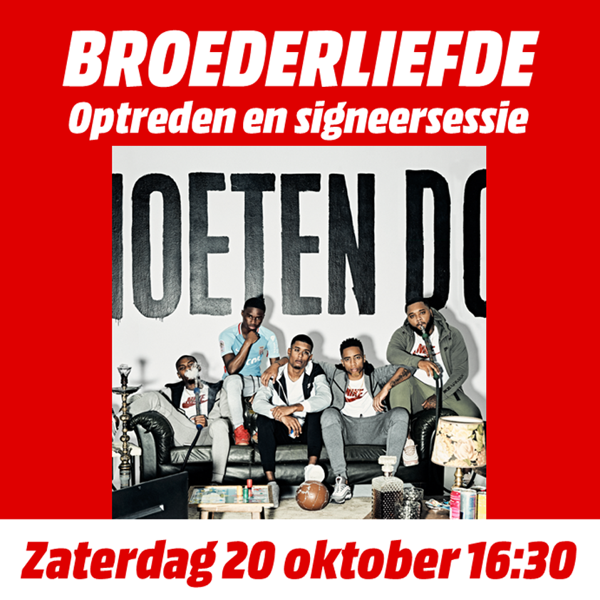 Aankomende zaterdag 20 oktober om 16.30 uur komt Broederliefde naar de MediaMarkt in Nieuwegein. Zij zullen dan een paar nummers te spelen van “We Moeten Door.” Na hun optreden geven de artiesten een signeersessie. De signeersessie is voor iedereen beschikbaar.