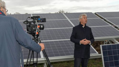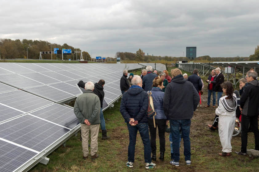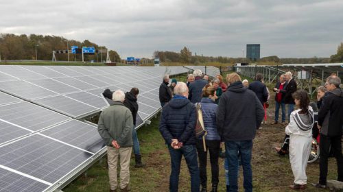 Zonnig nieuws op een bewolkte zaterdag! Tussen de buien door trotseerden participanten, onze videograaf Bart van Rooijen en fotograaf Paul Oor en andere belangstellenden de modderige paden van het Solarpark Galecop in het ‘pauzegebied’ aan de zuidkant van de A12. De Nieuwegeinse Wethouder Marieke Schouten en bestuurslid Arthur Simons van de coöperatie e-Lekstroom verrichtten daar de officiële opening van de nieuwste uitbreiding van dit nu al grootste zonnepark van Midden-Nederland.